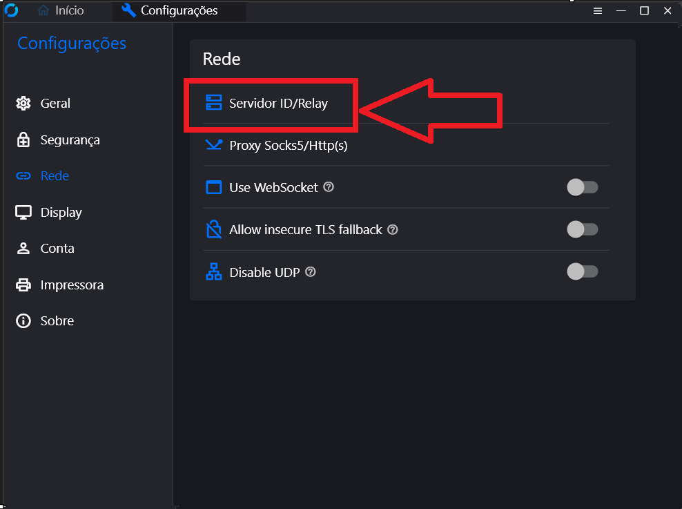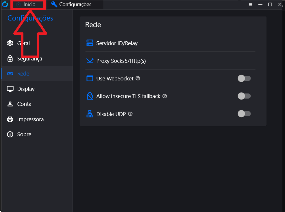 Passo 9- Agora Clique em “Início” para voltar a Tela inicial do RustDesk