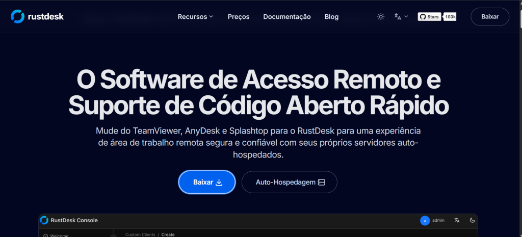 Passo 1- Faça o download do aplicativo de suporte remoto RustDesk entre em https://rustdesk.com/pt/